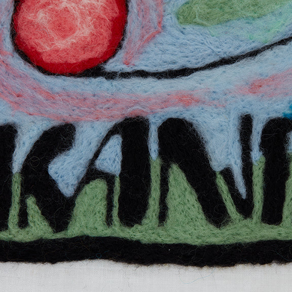 We begin by hand-dyeing Australian wool, and working in collaboration with embroidery artist Meeraj Bhai, we transform mass-produced imagery into tactile, sacred objects.