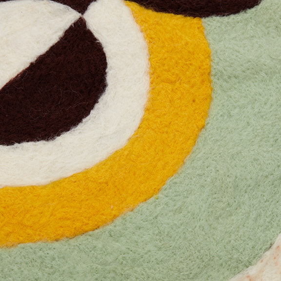 We begin by hand-dyeing Australian wool, and working in collaboration with embroidery artist Meeraj Bhai, we transform mass-produced imagery into tactile, sacred objects.