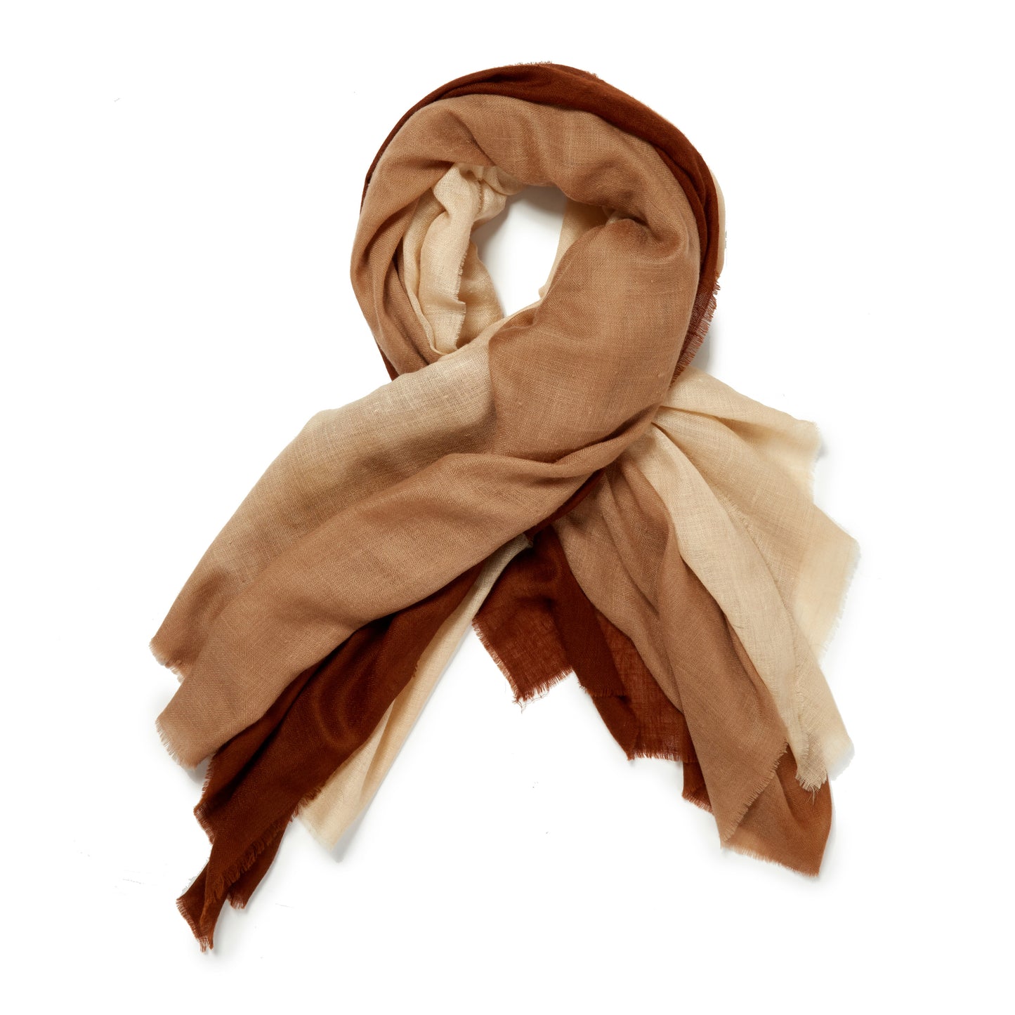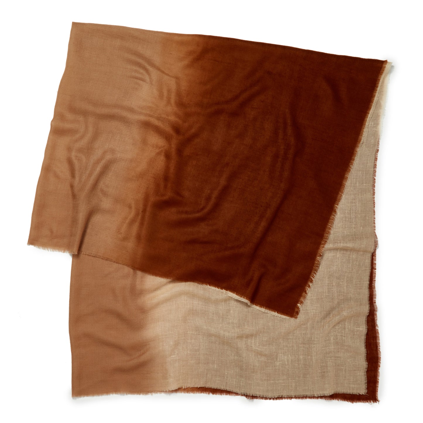 The Sienna Ombre Scarf is made from the softest cashmere and is hand-woven and hand-dyed by our talented artisan partners in India. The ombre takes you from a deep sienna to a flattering ecru and is finished with a gentle eyelash trim. The oversized shape allows it to be layered as a scarf or worn as a wrap, making it a highly versatile piece for many occasions.