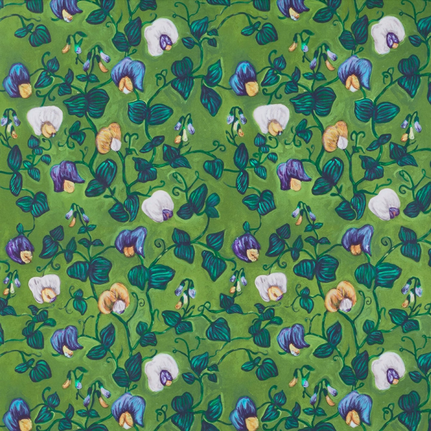 Inspired by a vintage wallpaper and my love of sweet pea flowers for their gorgeous colors, shapes and scents, this floral wallpaper celebrates each detail equally, stirring color, form, and shadow into a wild dance.